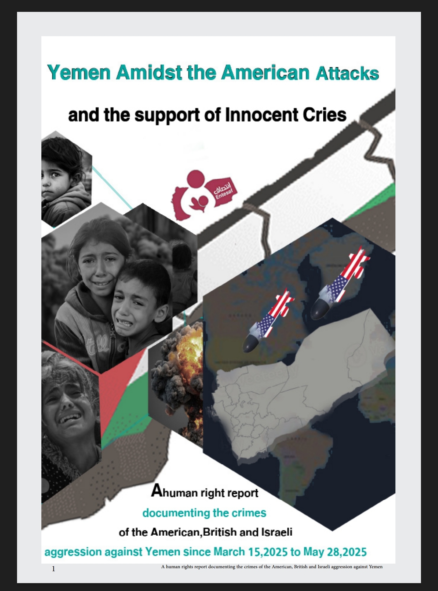 A report by the Entesaf Organization for Women and Children’s Rights, titled “Yemen: Between American Attacks and Support for Innocent Cries,” documents the most prominent crimes committed by the American aggression against Yemen from March 15 to May 28, 2025.