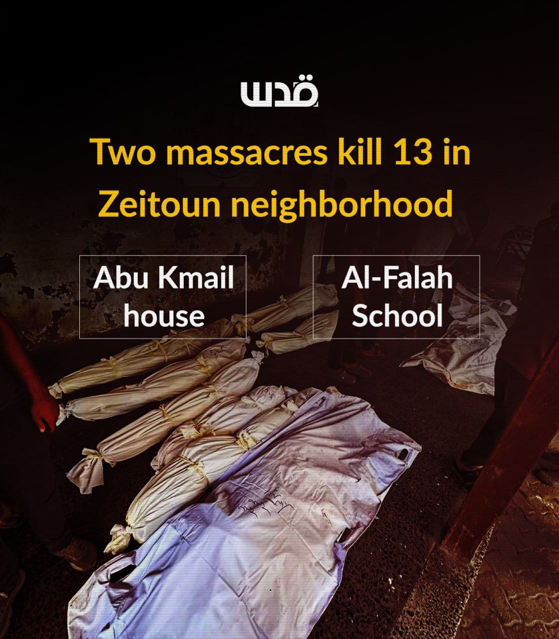 At least 13 civilians were slaughtered and dozens injured in two separate Israeli massacres overnight targeting Abu Kmail family and Al-Falah school in Gaza City’s Al-Daraj neighborhood.