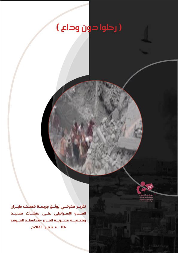 The Entesaf Organization for Women and Children’s Rights issued a human rights report titled “They Left Without Saying Goodbye.” The report addresses the crime of the Israeli airstrike on civilian and service facilities in Al-Hazm District, Al-Jawf Governorate, which resulted in the deaths of civilians, including women and children, on April 10, 2025.