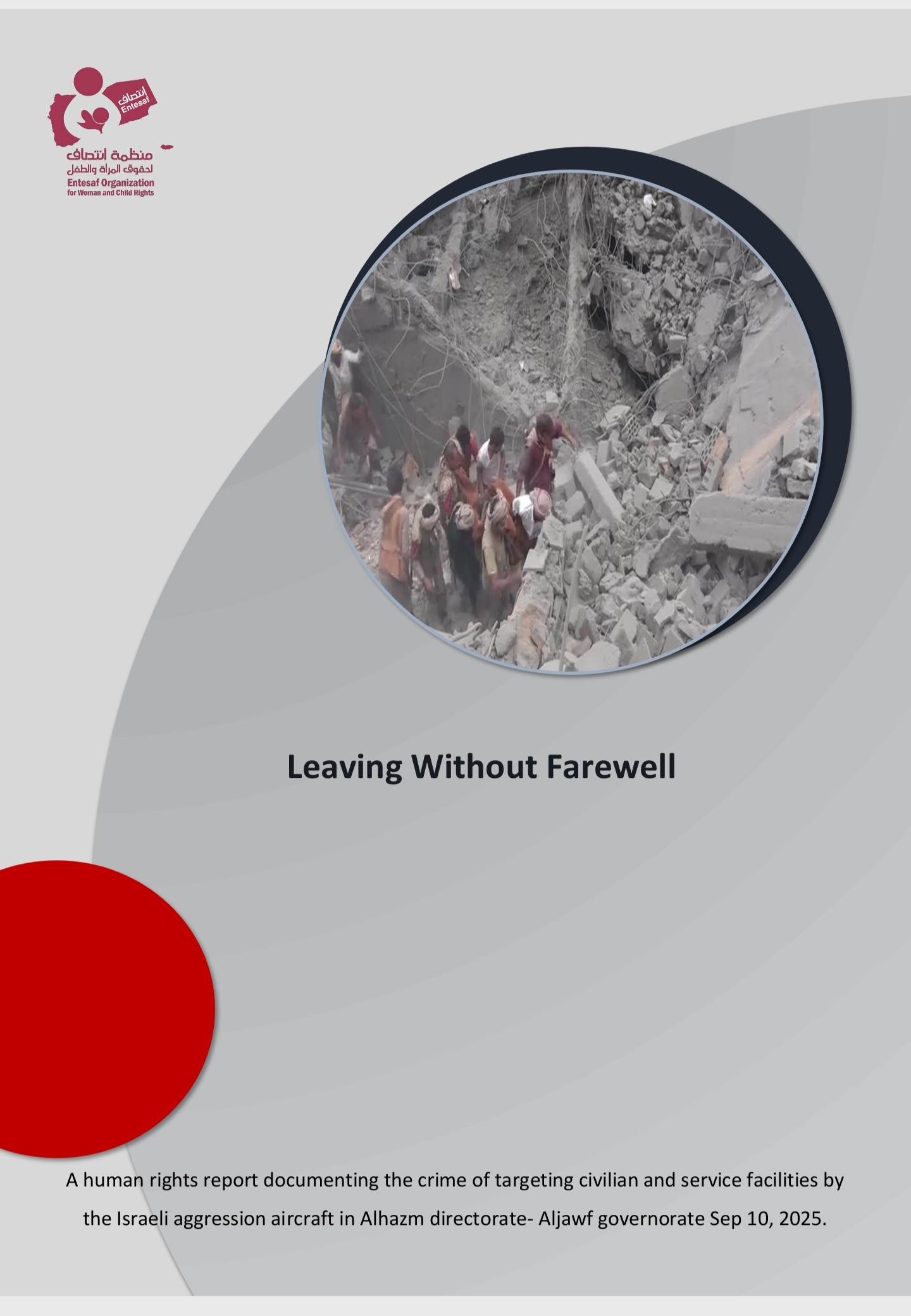 Entesaf for woman and child Rights released a human rights’ report entitled “Leaving Without Farewell”, where the report covered the crime committed by the Israeli aggressiton against civilian and service facilities in Alhazm district_ Aljawf which killed 8 civilians including 2 women, and wounded 18 civilians, on Sep 10, 2025.
