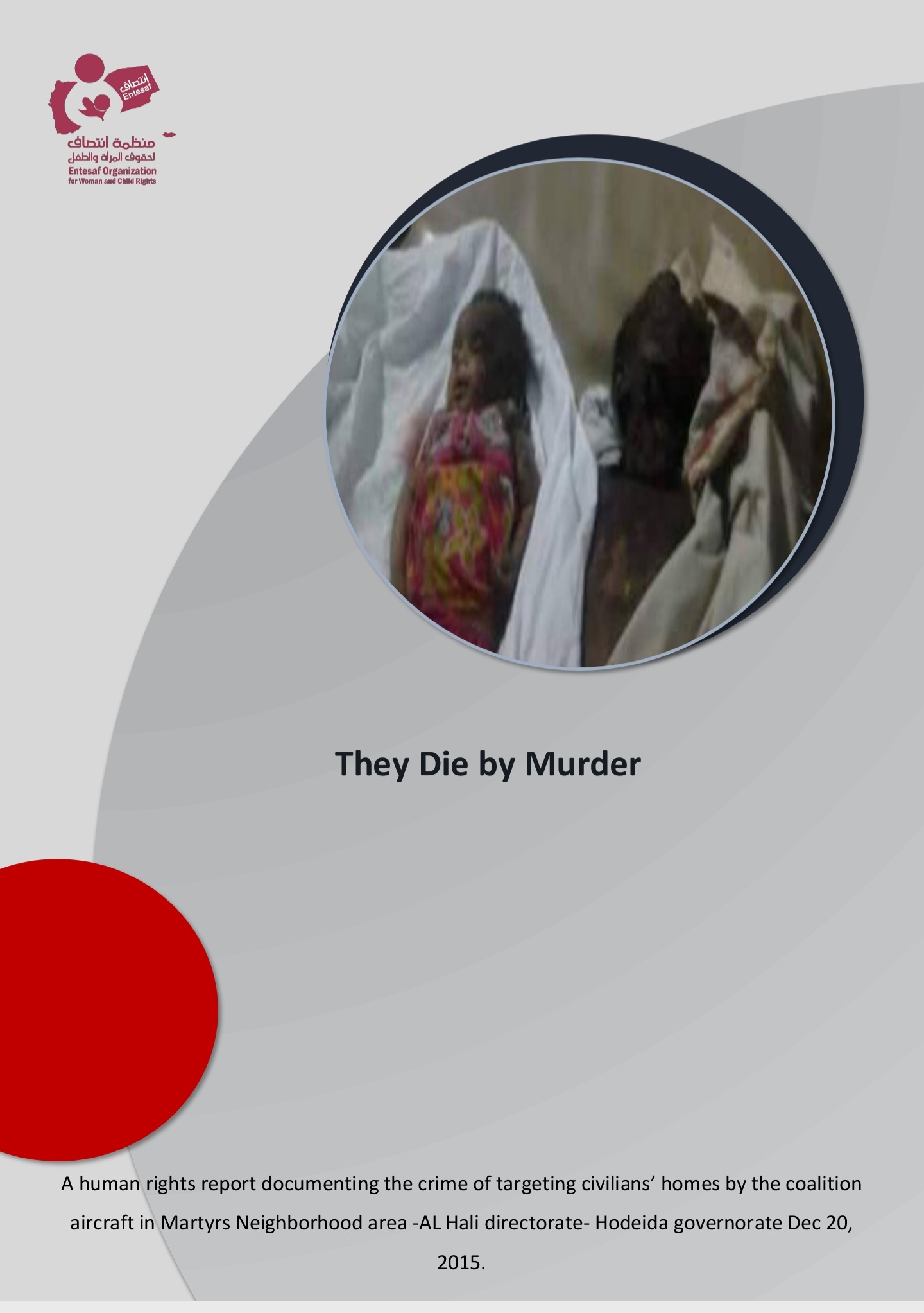 Entesaf for woman and child Rights released a human rights’ report entitled “They Die by Murder”, where the report covered the crime committed by the coalition of aggressiton against civilians in Al Hali directorate- Hodeida, which killed 7 civilians including 3 children, and wounded 10 civilians including a woman and a child.