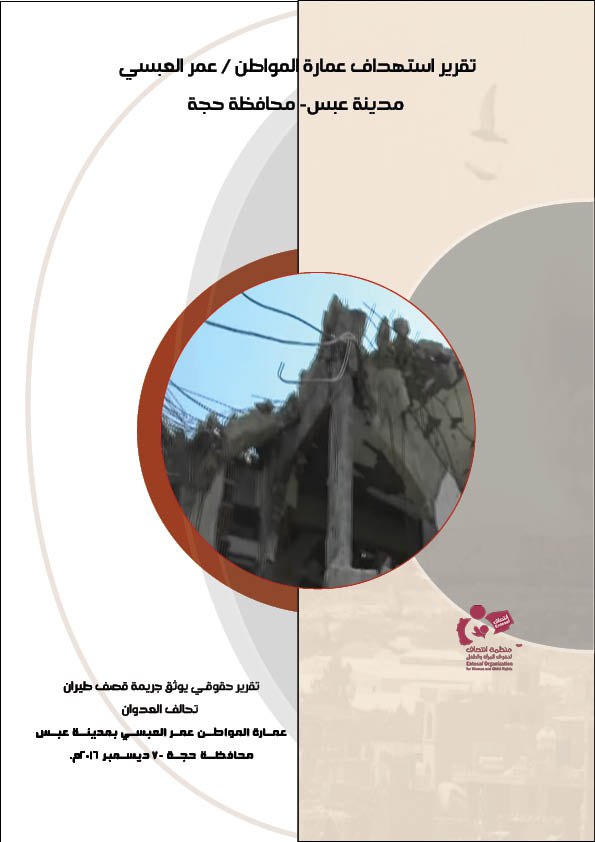 The Entesaf Organization for Women and Children’s Rights issued a human rights report documenting the targeting of Omar Al-Absi’s building in Abs District, Hajjah Governorate. The report details the crime of the Saudi-led coalition’s airstrike and artillery shelling of Al-Absi’s building in Abs District, Hajjah Governorate, which resulted in civilian casualties, including women and children, on December 2, 2016.