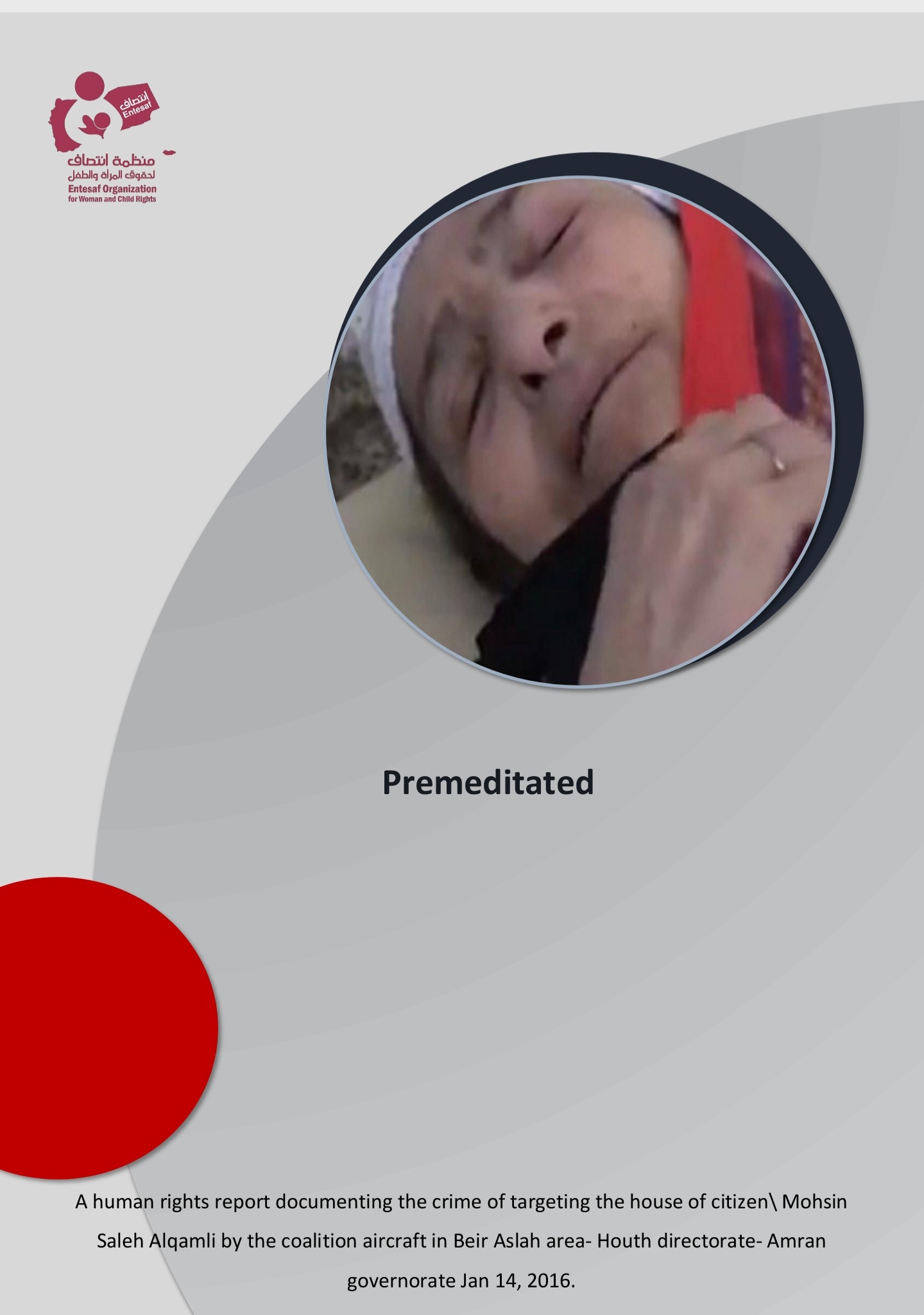 Entesaf for woman and child Rights released a human rights’ report entitled “Premeditated”, where the report covered the crime committed by the coalition of aggressiton against the family of citizen Mohsin Saleh Alqamli in Houth directorate- Amran, which killed a civilian and a woman and wounded 7 civilians ancluding a woman and 4 children.