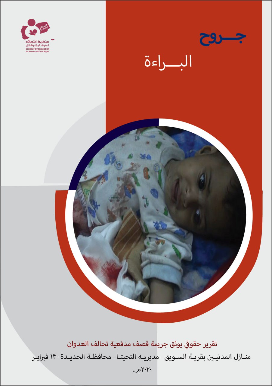 The Entesaf Organization for Women and Children’s Rights documented a human rights report entitled “Wounds of Innocence,” which addressed the crime committed by the Saudi-led coalition airstrikes on civilian homes in the village of Al-Suwaiq, Al-Tuhayta District, Hodeidah Governorate, on February 13, 2020. The attack resulted in civilian casualties, including women and children.
