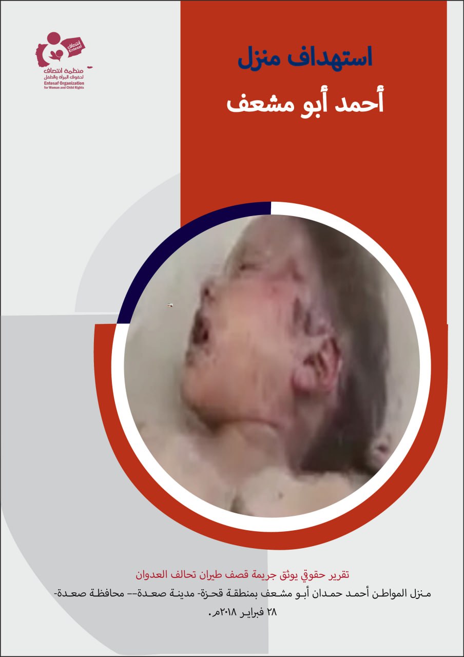 The Entesaf Organization for Women and Children’s Rights documented a human rights report entitled “Report on the Targeting of Ahmed Abu Mash’af’s Home.” The report addresses the crime of the Saudi-led coalition’s artillery shelling of the home of Ahmed Hamdan Abu Mash’af in the Qahza area of Sa’dah city, Sa’dah Governorate, which resulted in civilian casualties, including women and children, on February 28, 2018.