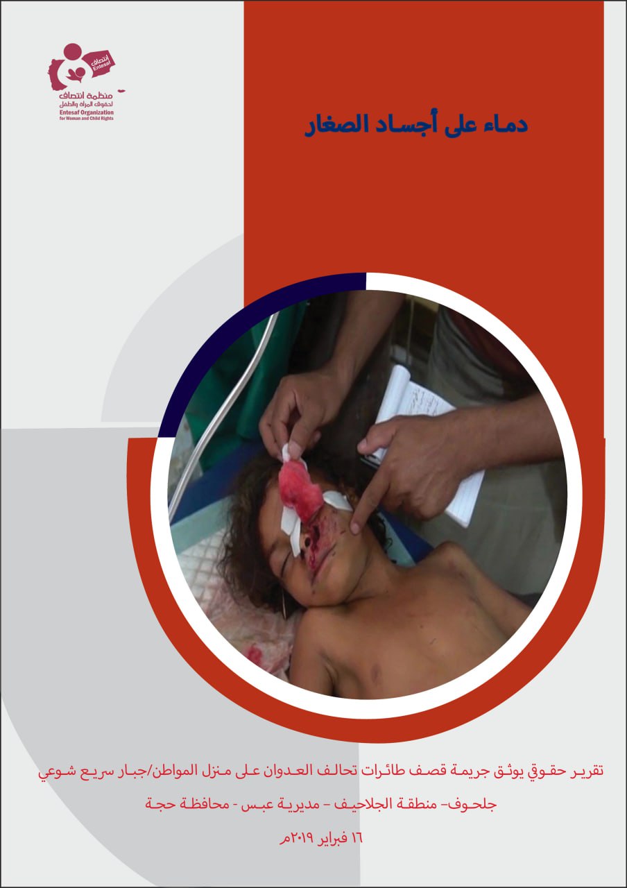 The Entesaf Organization for Women and Children’s Rights documented a human rights report entitled “Blood on the Bodies of Children,” which addressed the crime committed by the Saudi-led coalition airstrikes on the home of citizen Jabbar Sari’ Shua’i in the Al-Jalajif area of Abs District, Hajjah Governorate, which resulted in the deaths of civilians, including women and children, on February 16, 2019.