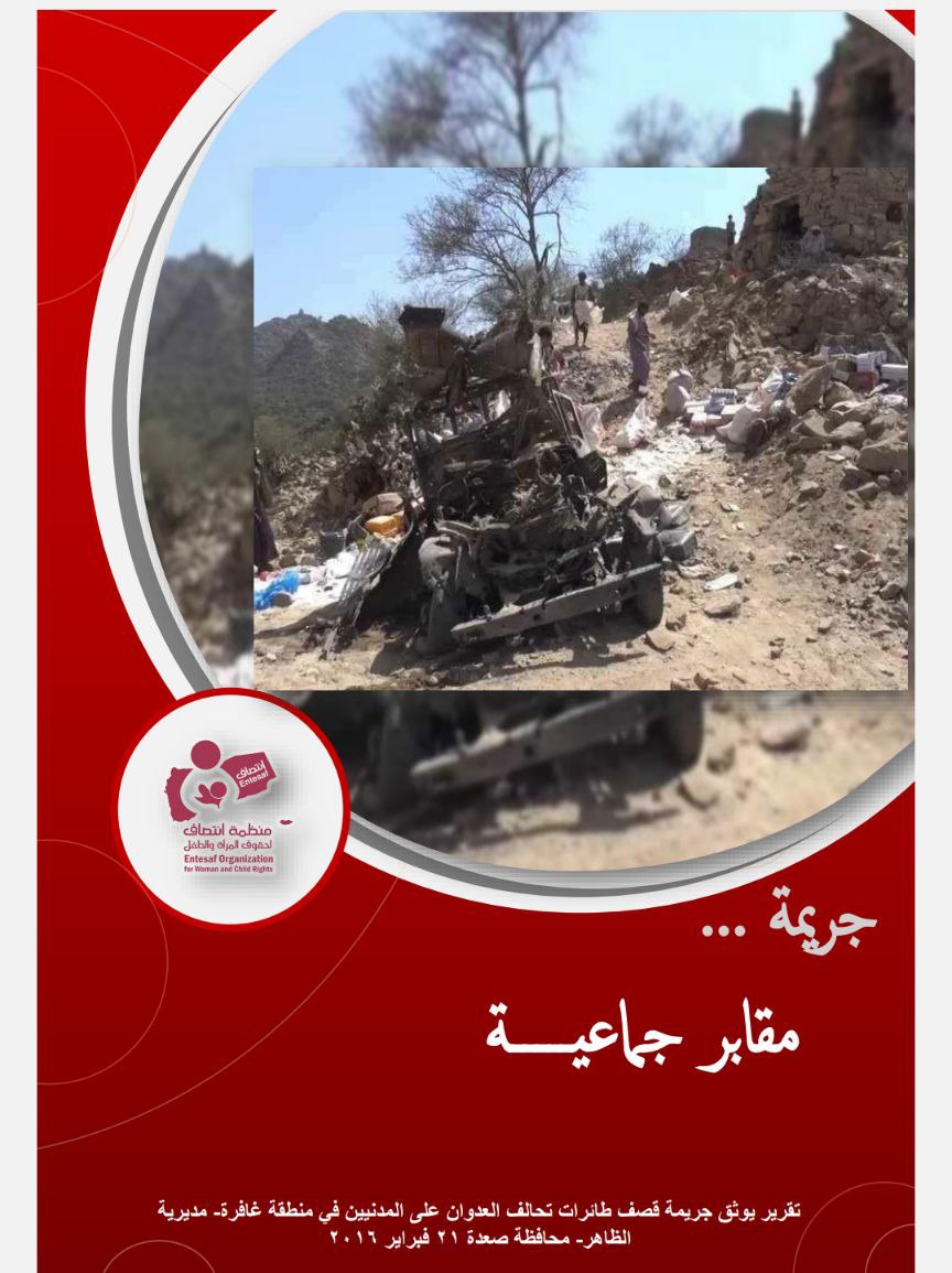 The Entesaf Organization for Women and Children’s Rights documented a human rights report entitled “The Mass Graves Crime,” which addressed the crime committed by the Saudi-led coalition against civilians in the Ghafra area of Al-Dhaher district, Saada Governorate, on February 21, 2016. The report detailed the crime, including witness testimonies, and discussed the legal framework of the crime according to international laws and conventions. It relied on the organization’s statistics regarding the details of the crime and the number of victims, as well as interviews conducted with witnesses. The report also consulted international legal texts, treaties, and agreements to clarify the legal framework of the crime committed against the women and children of the Ghafra area.