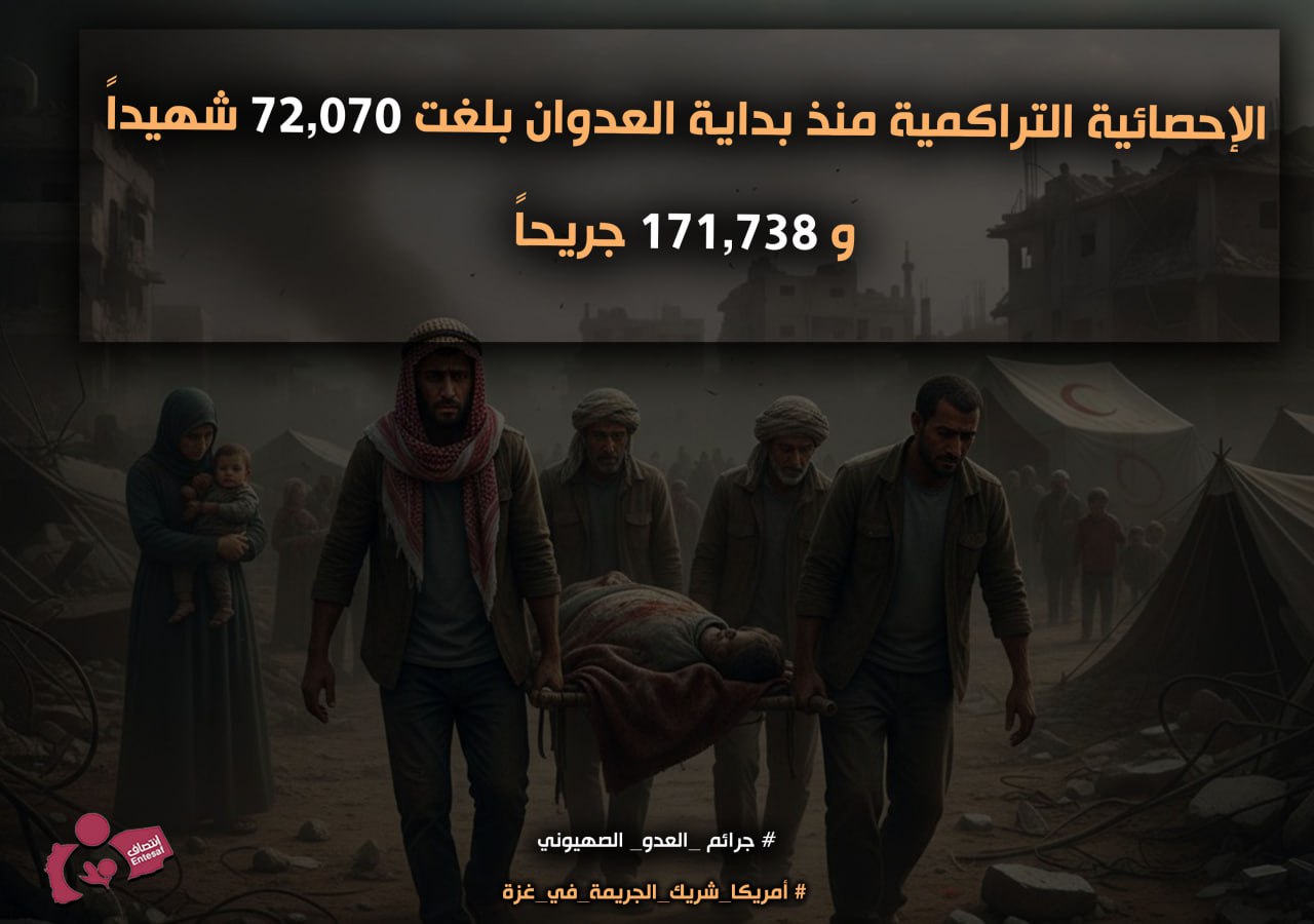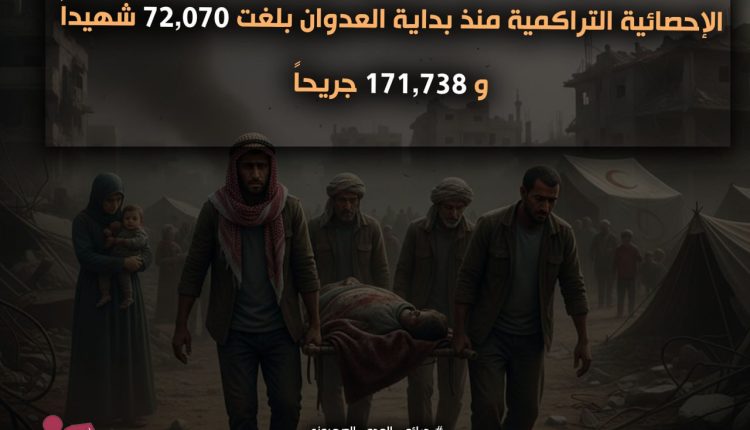 The cumulative statistics since the beginning of the aggression have reached 72,070 martyrs and 171,738 wounded