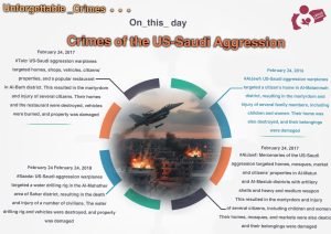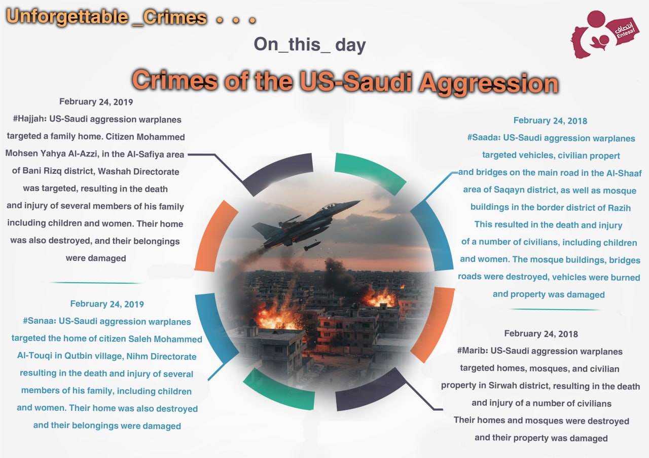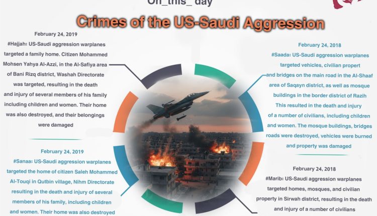 5. #Saada: US-Saudi aggression warplanes targeted vehicles, civilian property, and bridges on the main road in the Al-Shaaf area of Saqayn district, as well as mosque buildings in the border district of Razih. This resulted in the death and injury of a number of civilians, including children and women. The mosque buildings, bridges, and roads were destroyed, vehicles were burned, and property was damaged.