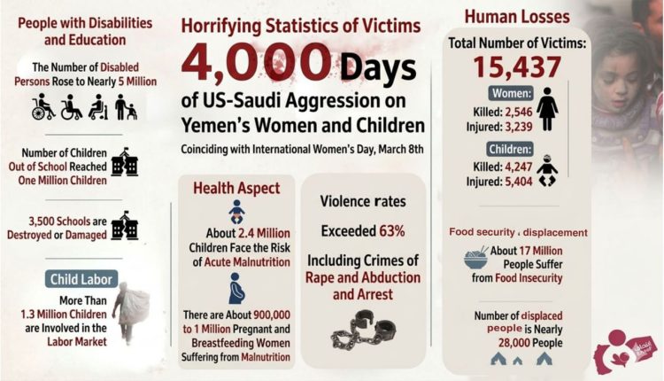 On the occasion of International Women’s Day, marking 4,000 days since the start of the aggression, the “Entisaf for Women and Child Rights” organization revealed shocking statistics documenting the scale of the humanitarian tragedy that has befallen women and children in Yemen. These figures, which come amidst a suspicious international silence, expose the hollowness of international slogans about human rights, confirming that what Yemeni women have been experiencing for a decade—killing, displacement, and siege—exceeds all human rights descriptions and places the international community before a moral test that it has failed for thousands of days.