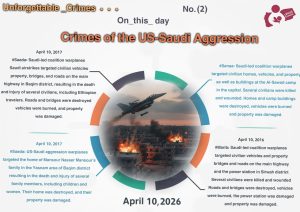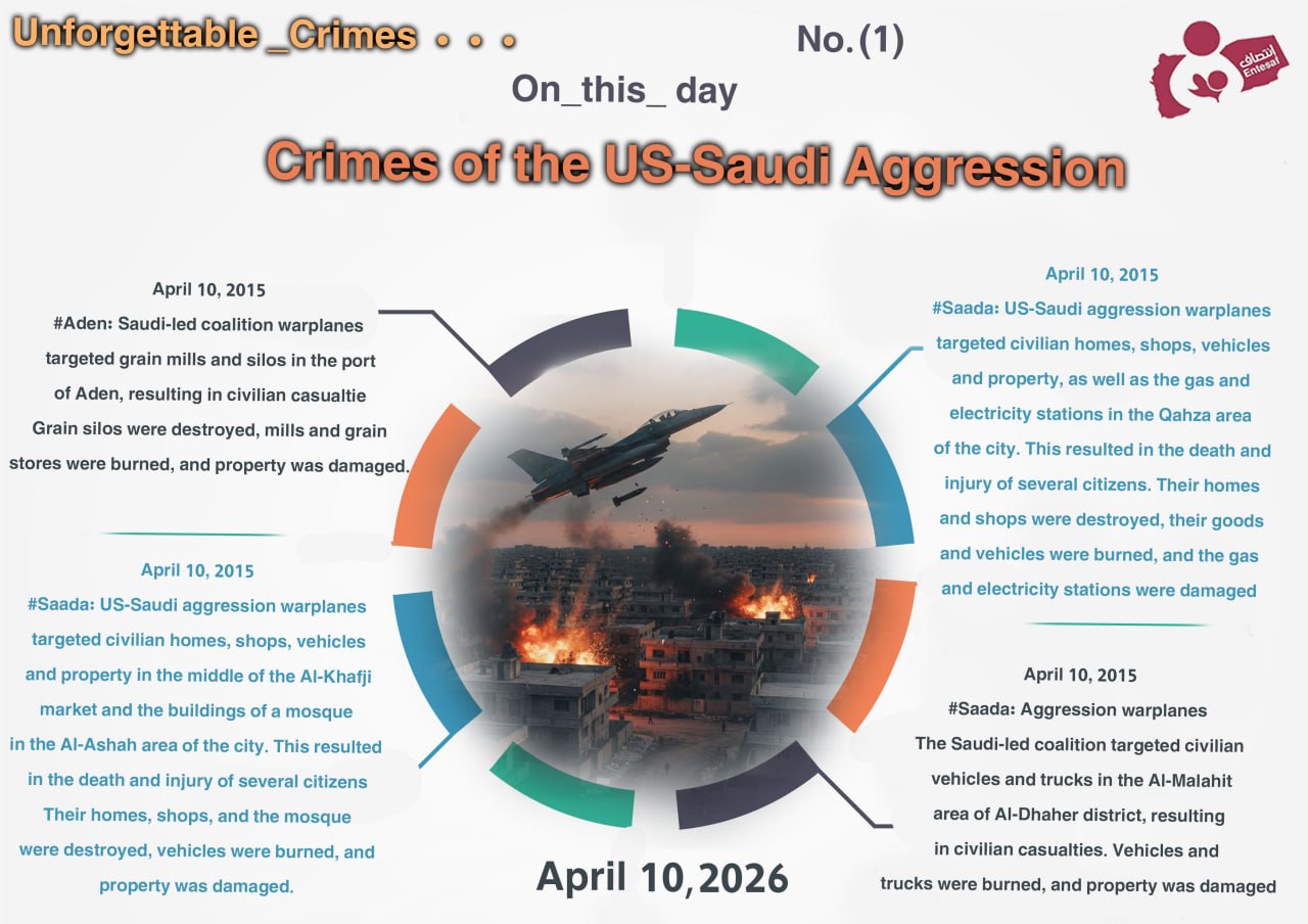 Crimes Commit by Saudi-led coalition On Apr 10, 2026 Share #OnThis Day Share FacebookTwitterGoogle+ReddItWhatsAppPinterestEmail