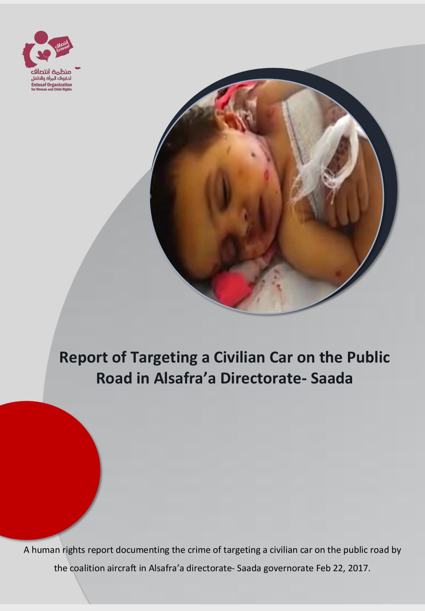 Entesaf for woman and child Rights released a human rights’ report entitled “Report of Targeting a Civilian Car on the Public Road in Alsafra’a Directorate- Saada”, where the report covered the crime committed by the coalition of aggression against the civilians who were in a civilian car in Saada governorate, which killed a child.