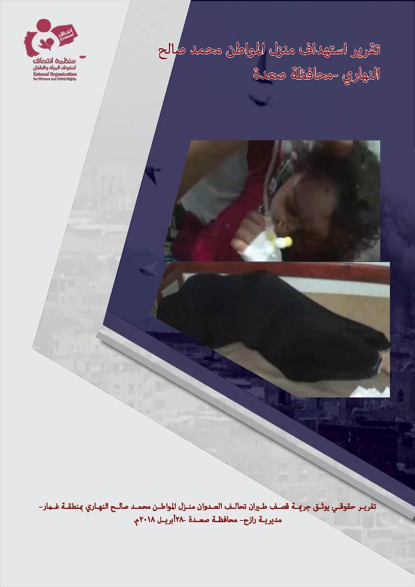 The Entesaf Organization for Women and Children’s Rights documented a human rights report entitled “Report on the Targeting of the Home of Citizen Mohammed Saleh Al-Nahari – Sa’dah Governorate.” The report addresses the crime committed by the Saudi-led coalition airstrikes on the home of citizen Mohammed Saleh Al-Nahari in the Ghamar area of Razih District, Sa’dah Governorate, which resulted in the deaths of civilians, including women and children, on April 28, 2018.